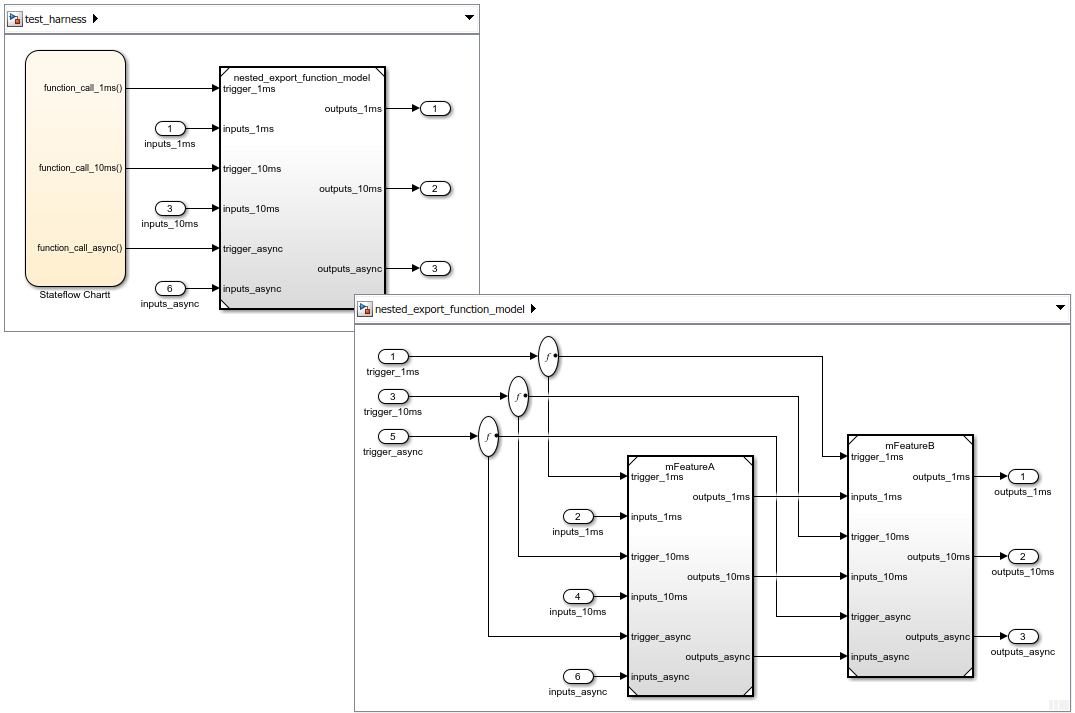 Модель export-function не может содержать ссылочную модель с асинхронными входами вызова функции, но может содержать подсистемы вызова функции и модели вызова функции. Модель с асинхронными входами вызова функции может содержать модель экспорта функции, подсистему вызова функции или модель вызова функции.
