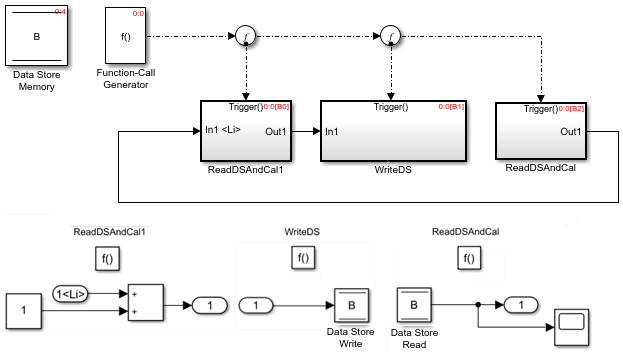 В следующей модели входные данные для блока Inport в подсистеме функционального вызова ReadDSAndCal1 фиксируется (индицируется <Li>) и не может изменяться во время выполнения подсистемы. Блоки чтения хранилища данных и записи хранилища данных вызываются в каждой подсистеме вызова функций. Первый и второй функциональные вызовы записывают данные, а последний функциональный вызов считывает данные в блок памяти хранилища данных.