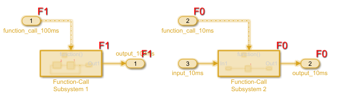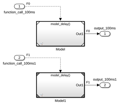 В следующей модели export-function для подсистемы Function-Call 2 с параметром Sample time for Inport block 2 установлено значение 0.01 (10 мс) выполняется перед подсистемой Function-Call 1 с параметром Sample time for Inport block 1, установленным на 0.1 (100 мс).
