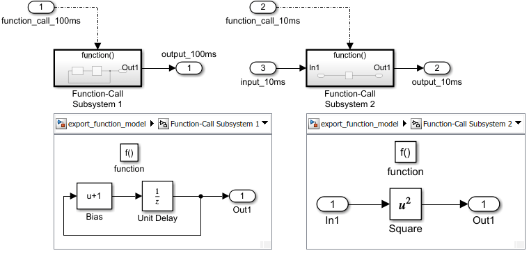 Следующая модель export-function содержит две функции, определенные блоками Function-Call Subsystem. Пошаговую процедуру создания этой модели см. в разделе Создание модели Export-Function.