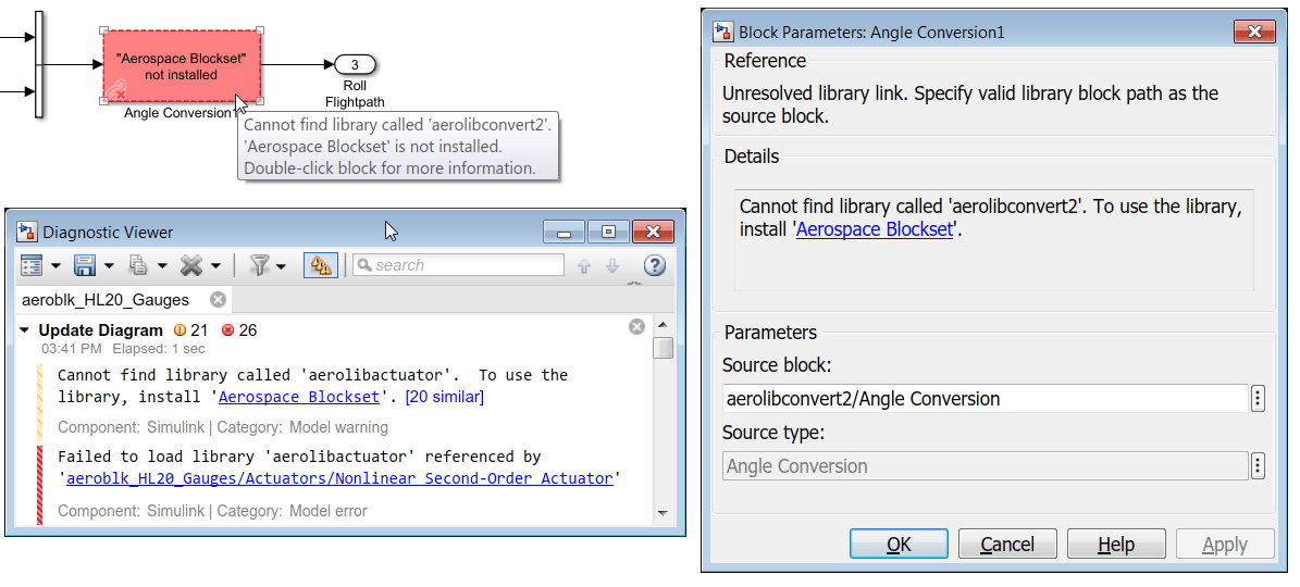 Simulink пытается помочь найти и установить отсутствующие продукты, которые требуется запустить модели. При открытии модели, содержащей встроенные блоки или ссылки на библиотеки из отсутствующих продуктов, отображаются метки и ссылки, помогающие устранить проблему.