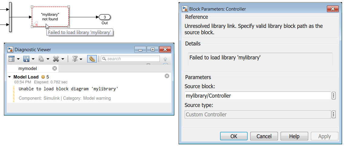 Если Simulink ® не может найти ни блок библиотеки, ни исходную библиотеку по пути MATLAB ® во время обновления связанного блока, связь становится неразрешенной. Simulink изменяет внешний вид этих блоков.
