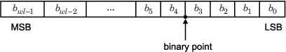 Двоичные числа представлены либо в виде данных с фиксированной запятой, либо в виде данных с плавающей запятой. Тип данных с фиксированной точкой характеризуется размером слова в битах, двоичной точкой и подписью или неподписью. Позиция двоичной точки - это средство, с помощью которого значения фиксированной точки масштабируются и интерпретируются. При использовании Designer™ Fixed-Point типы данных с фиксированной точкой могут представлять собой целые числа, дробные числа или обобщенные числа с фиксированной точкой. Основным отличием этих типов данных является их двоичная точка по умолчанию. Например, двоичное представление обобщенного числа с фиксированной точкой (со знаком или без знака) показано ниже: