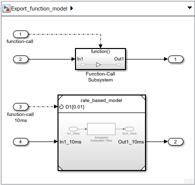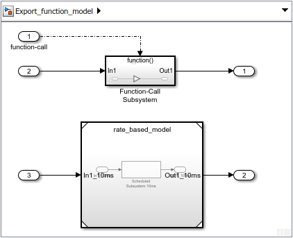 Можно создать код из модели, включающей как подсистемы вызова функций, так и запланированные подсистемы. Создайте модель на основе скорости с запланированными подсистемами, а затем добавьте модель в модель с функцией экспорта по ссылке из блока модели.
