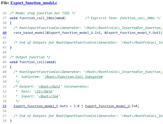 В сгенерированном коде каждый блок Inport функции корневого уровня создает функцию void-void. Имя функции - это имя выходного сигнала из блока. Если имя сигнала отсутствует, то имя функции выводится из имени блока. В этом примере имя функции было получено из имени блока.