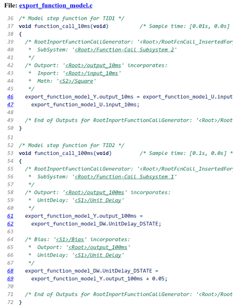 В сгенерированном коде каждый блок Inport функции корневого уровня создает функцию void-void. Имя функции - это имя выходного сигнала из блока. Если имя сигнала отсутствует, то имя функции выводится из имени блока. В этом примере имя функции было получено из имени блока.