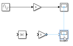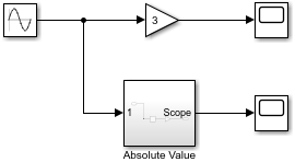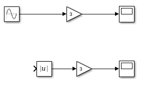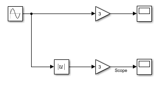 Вход второго блока усиления является абсолютным значением выхода блока синусоидальной волны. Чтобы использовать один блок синусоидальной волны в качестве входного сигнала для обеих операций усиления, создайте ответвление из выходного сигнала блока синусоидальной волны.