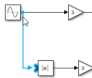 Создайте ветвь из вывода блока синусоидальной волны в блок Abs. Щелкните входной порт блока Abs. Переместите курсор к линии выходного сигнала из блока синусоидальной волны. Появится строка предварительного просмотра. Щелкните, чтобы создать ветвь.