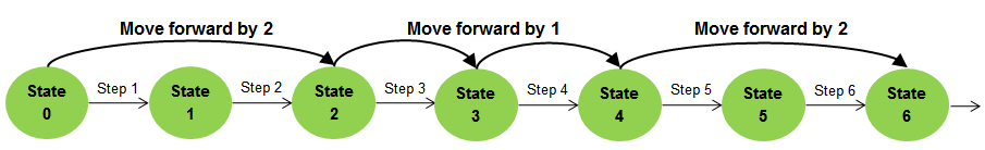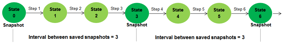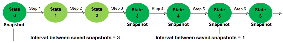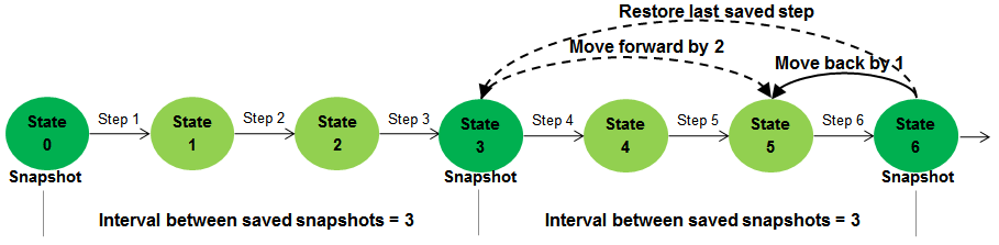 На следующем рисунке показано, как настройки снимка Simulation Stepper могут изменить то, что происходит при обратном шаге. Предположим, что интервал между снимками файловой системы равен трем, а начиная с состояния «Шесть» для параметра «Переместить назад/вперед» задано значение «Один». Степпер сначала восстанавливает состояние моделирования до последнего сохраненного снимка (состояние три), а затем имитирует два основных шага времени для достижения требуемого состояния (состояние пять).