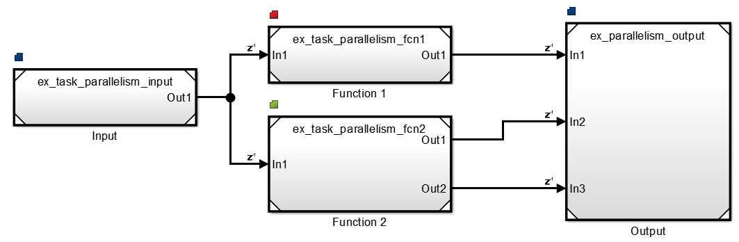 Обратите внимание, что задержки вводятся между различными задачами, обозначенными значком z-1. Введение этих задержек может привести к различным выходам модели в Simulink. Убедитесь, что модель имеет ожидаемые выходные данные при моделировании параллельной модели.