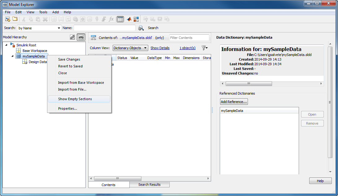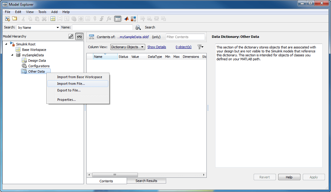 На панели «Иерархия моделей» щелкните правой кнопкой мыши раздел «Другие данные» словаря и выберите «Импорт из файла». Затем найдите и выберите файл MAT или MATLAB, содержащий данные ссылки для импорта.