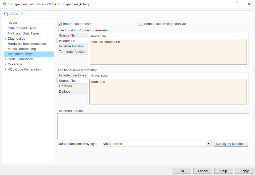 Укажите исходные и заголовочные файлы C для моделирования на панели Цель моделирования (Simulation Target) диалогового окна Параметры конфигурации модели (Model Configuration Parameters). Включите файл заголовка, используя двойные предложения, например: #include "program.h". Если необходимо получить доступ к исходным и заголовочным файлам C вне рабочей папки, укажите путь на панели «Цель моделирования» в текстовом поле «Включить каталоги».