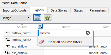 Чтобы выполнить фильтрацию по блокам или сигналам, выбранным в модели, рядом с полем Содержимое фильтра (Filter contents) выберите кнопку Фильтр с помощью выбора (Filter using selection). Затем при щелчке по блокам и сигналам в модели в редакторе данных модели отображаются только те строки, которые относятся к этому блоку или сигналу. При наличии нескольких блоков или сигналов в редакторе данных модели отображаются только те строки, которые относятся к этим элементам модели.