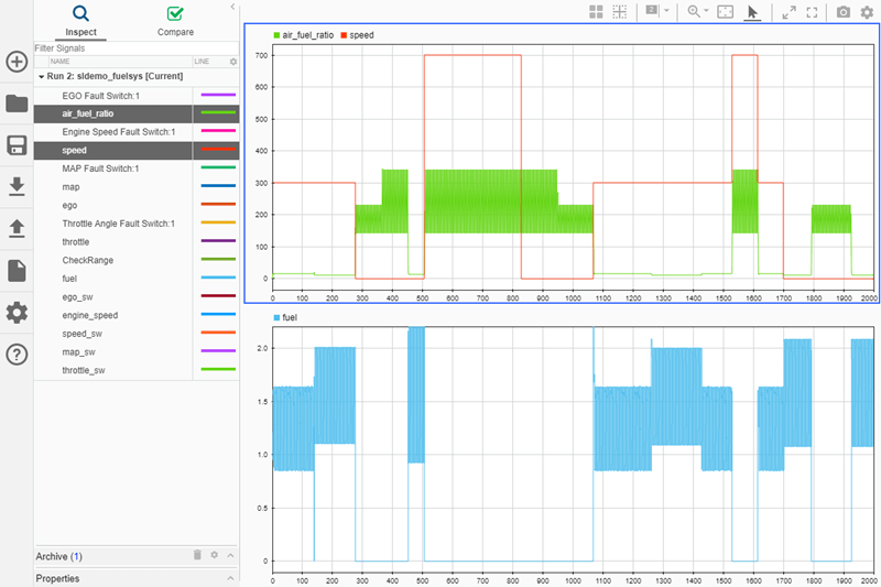 Например, создайте вид сигналов из sldemo_fuelsys модель. Затем смоделировать sldemo_fuelsys снова модель. Сигналы из предыдущего прогона очищаются от графиков, а инспектор данных моделирования выводит данные из текущего моделирования при выполнении моделирования. Предыдущий прогон также перемещается в архив, уменьшая нагромождение в рабочей области.