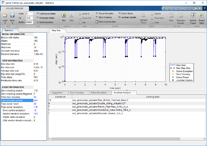 Можно установить флажок Модель (Model) Якобиан (Jacobian) в профилировщике решателя (Solver Profiler), чтобы записывать обновления в матрицу якобиана для модели. При запуске профилировщика решателя на модели можно просмотреть журналы на вкладке Анализ якобиана (Jacobian Analysis).