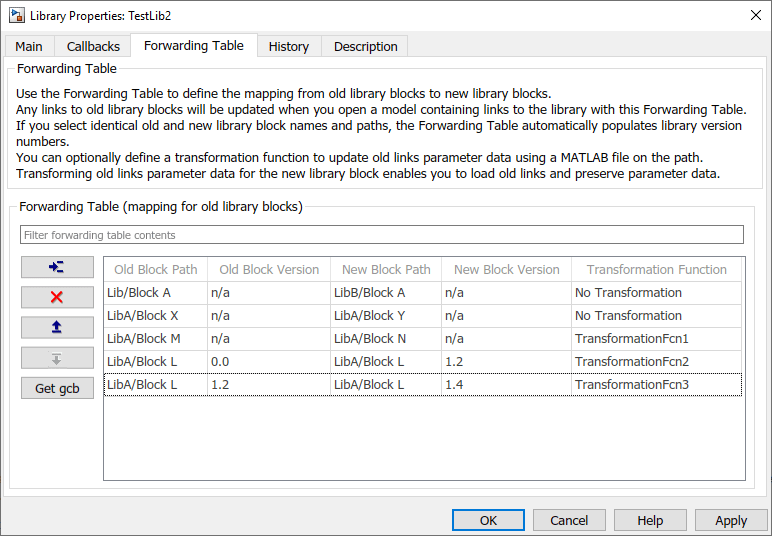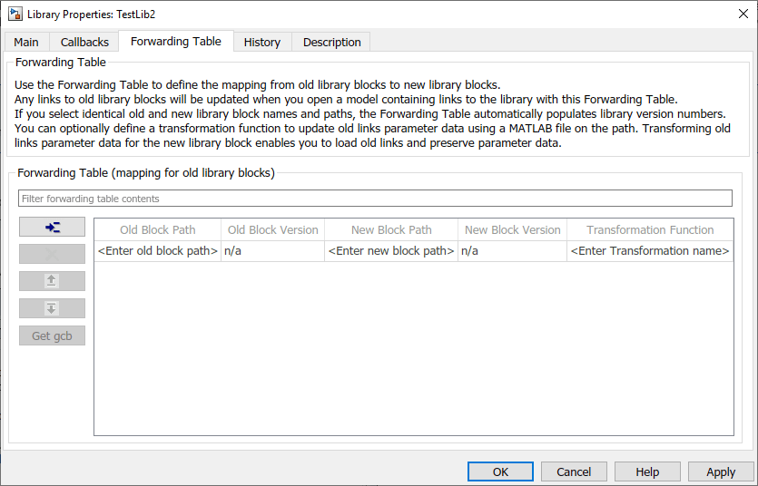 В командной строке можно создать простую таблицу пересылки, определяющую старые расположения и новые расположения блоков, которые были перемещены внутри библиотеки или в другую библиотеку. Таблицу пересылки можно связать с библиотекой, установив ее ForwardingTable параметр для массива ячеек из двухэлементных массивов ячеек, каждый из которых задает старый и новый путь перемещаемого блока. Например, синтаксис для создания таблицы пересылки и назначения ее библиотеке с именем Lib1 является: