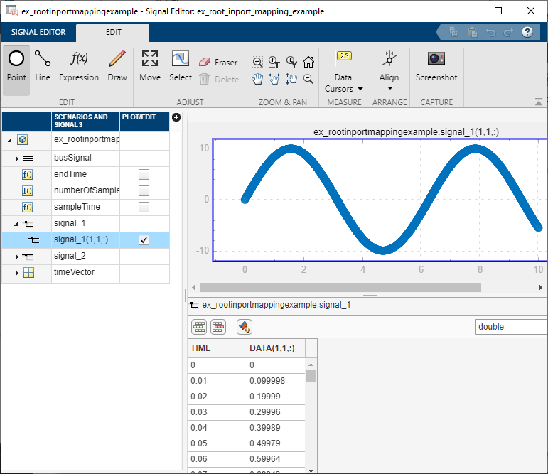 Вы можете визуализировать сигналы. На панели инструментов диалогового окна «Отображение корневого ввода» выберите «Сигналы» > «Редактировать MAT-файл».