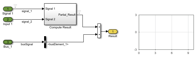 Эта модель имеет три блока ввода на корневом уровне. Два блока Inport выводят скалярные сигналы, а другой блок Inport выводит данные шины. Откройте модель.