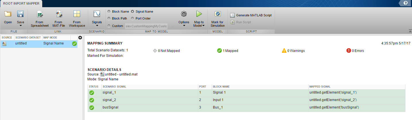 Сопоставьте данные. На панели Навигация выберите набор данных сценария. На панели инструментов щелкните Сопоставить с моделью (Map to Model). В диалоговом окне отображаются сопоставленные данные.