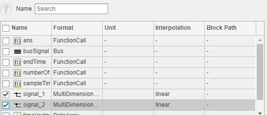 Чтобы снять переменные данных, установите флажок Имя (Name). Затем установите флажки для busSignal, signal_1, и signal_2 сигналы.
