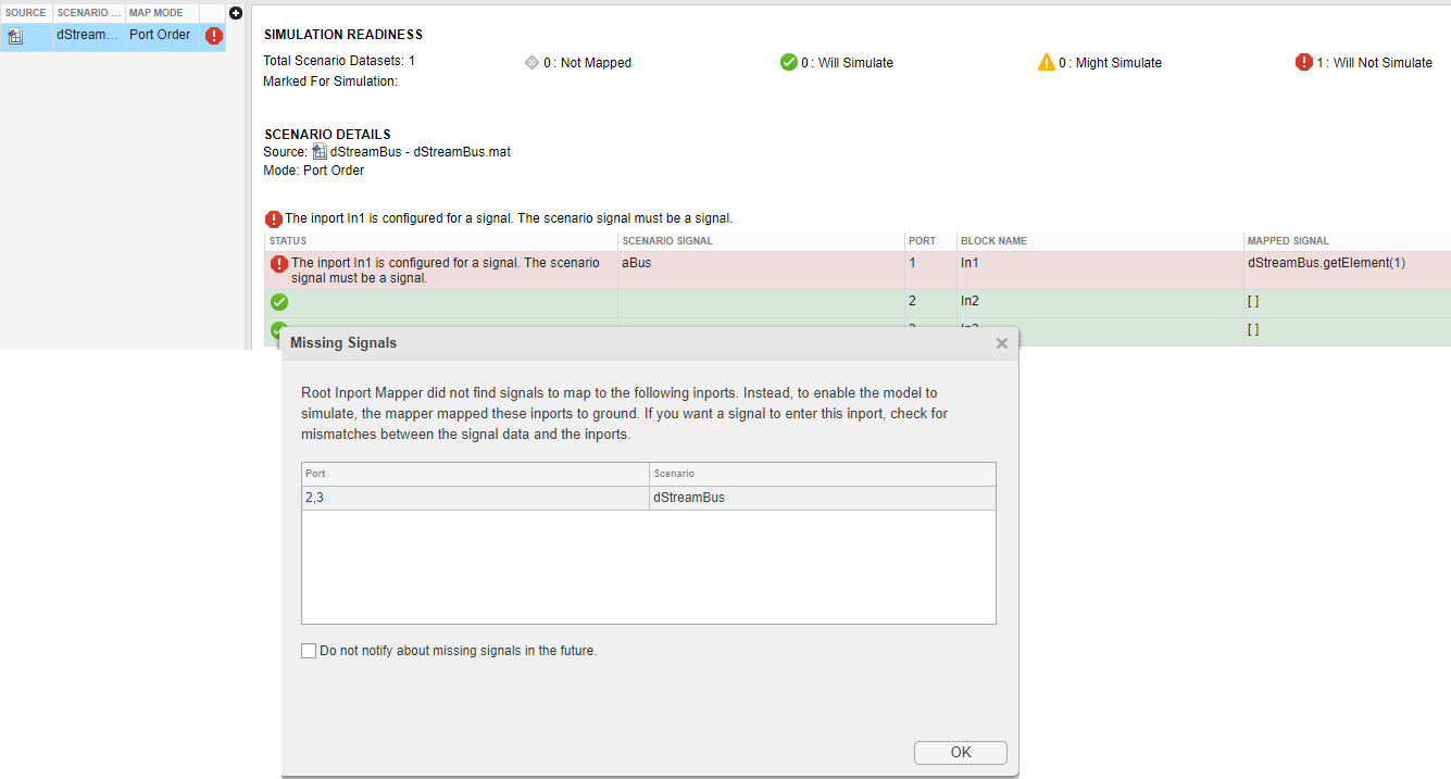Для того чтобы модель могла моделировать, если приложение Root Inport Mapper не находит сигналы входного порта для отображения, оно сопоставляет эти входные порты с землей и отображает отображенный сигнал как пустой ([]).