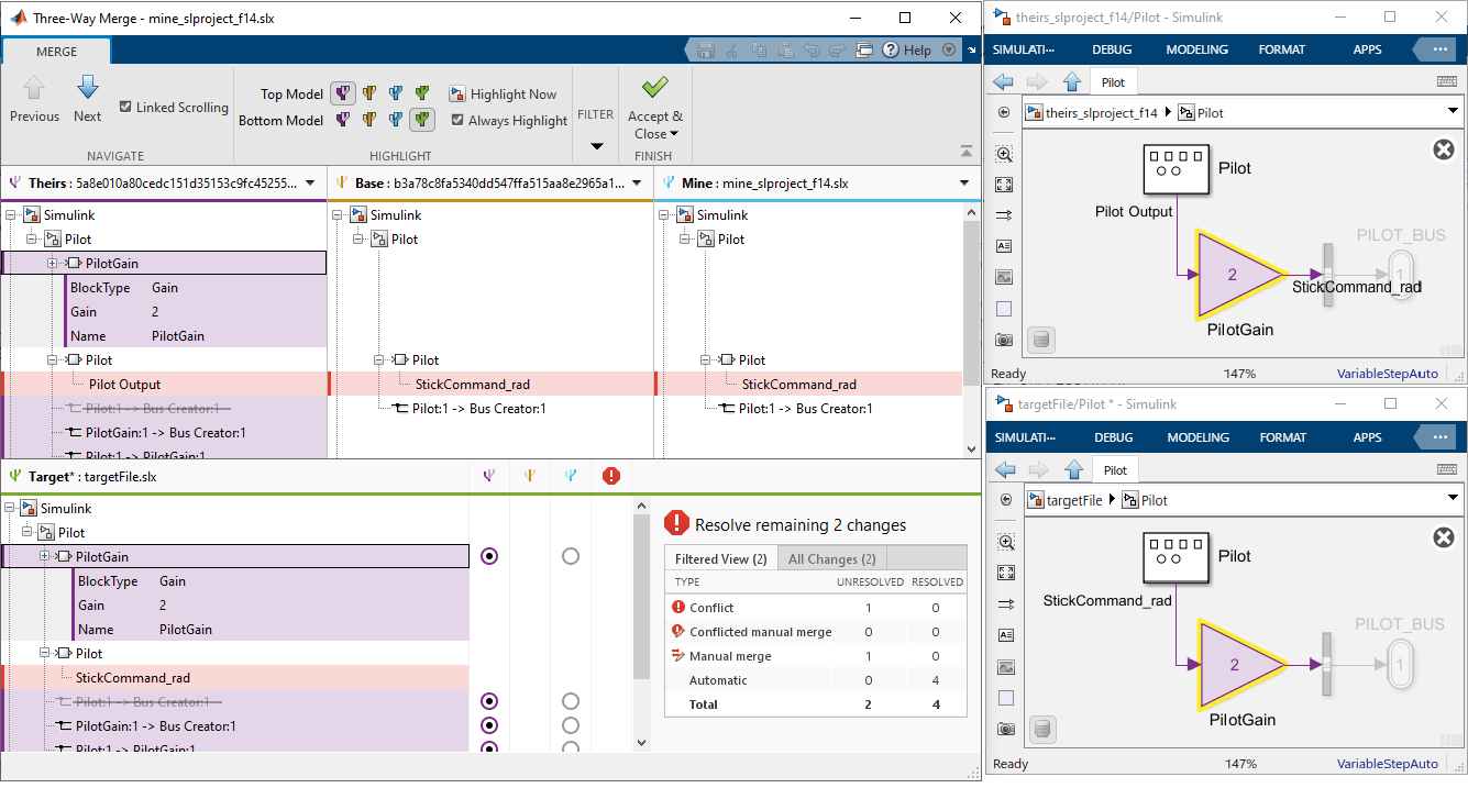 baseFile, mineFile, и theirsFile в targetFile.Из отчета о сравнении можно объединить две модели Simulink ®. Элементы контекстного меню Сравнить (Compare) из проекта или браузера Текущая папка (Current Folder) открывают двустороннее объединение модели. Если вы используете систему управления версиями и хотите разрешить конфликты с помощью трехстороннего объединения моделей, см. раздел Разрешение конфликтов с помощью трехстороннего объединения моделей.