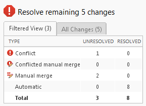 Просмотрите сводную таблицу, чтобы узнать количество автоматических слияний и оставшихся конфликтов, которые необходимо разрешить.