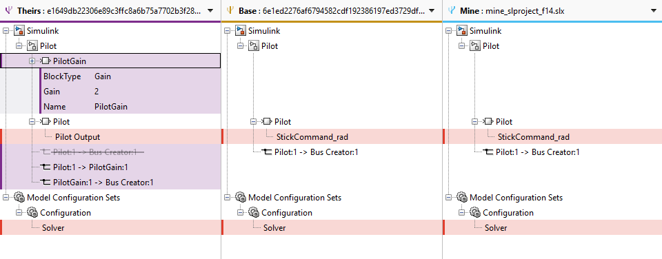 Пример трехстороннего слияния см. в разделе Разрешение конфликтов с трехсторонним объединением Simulink.