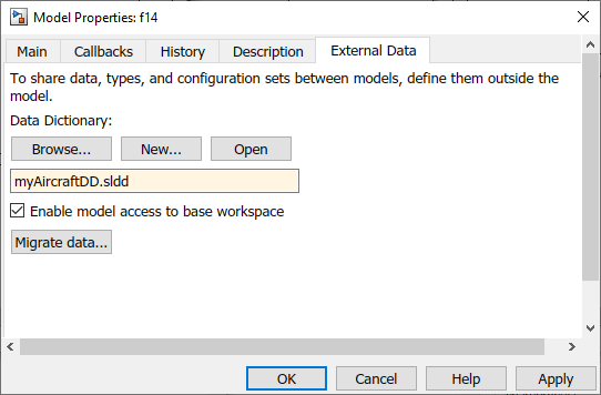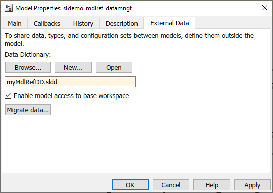 Чтобы разрешить доступ к базовому рабочему пространству для модели, в диалоговом окне Свойства модели (Model Properties) на вкладке Внешние данные (External Data) выберите Включить доступ модели к базовому рабочему пространству (Enable model access to base workspace). Для новой модели этот флажок установлен по умолчанию. Если модель не связана со словарем данных, необходимо выбрать этот параметр.