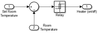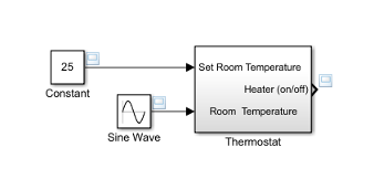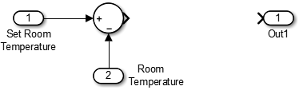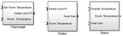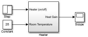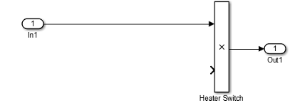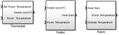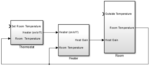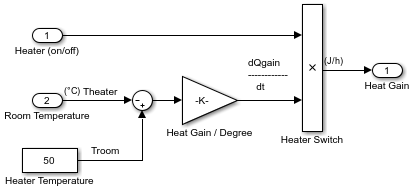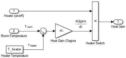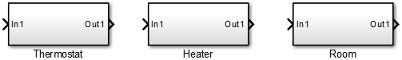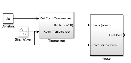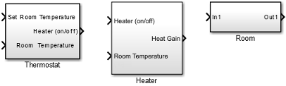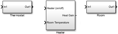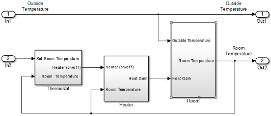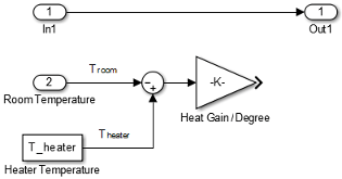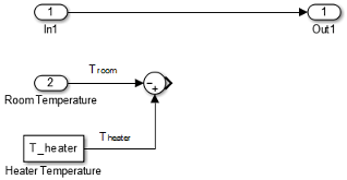 Обратите внимание, что блок нагревателя имеет второй входной порт и что каждый порт соответствует блоку ввода или блоку вывода в подсистеме.