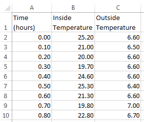 Просмотрите график измеренных данных. Данные о внутренней температуре показывают скачки температуры при включении нагревателя горячего воздуха. Такая схема типична для системы нагрева горячим воздухом.
