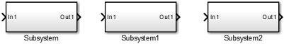 Добавление блоков подсистемы. Перетащите три блока подсистемы из библиотеки «Порты и подсистемы» в новую модель в редакторе Simulink Editor.