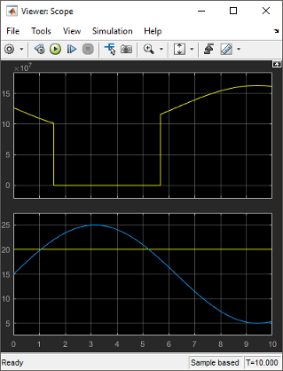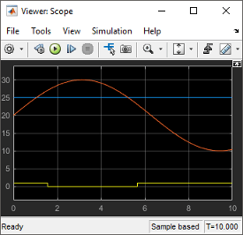 Измените внешнюю температуру в блоке синусоидальной волны так, чтобы верхние значения превышали заданную температуру.