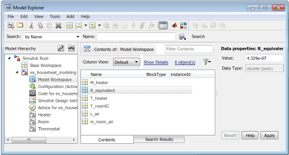 ex_househeat_modeling_prepared.slx.Уточнить параметры модели. С помощью моделей Simulink можно в интерактивном режиме изменять параметры модели, а затем наблюдать изменения в поведении модели. Этот подход позволяет быстро оценить модель и проверить проект.