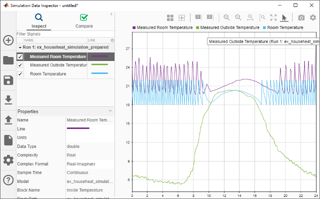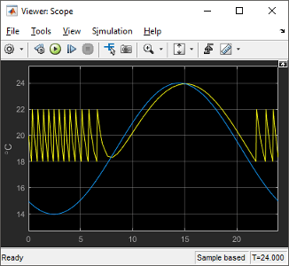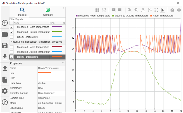 Просмотрите сигналы. Минимальное и максимальное значения для моделируемой комнатной температуры теперь соответствуют измеренным значениям комнатной температуры.