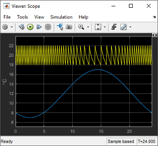 Когда наружная температура ниже установленной комнатной температуры, комнатная температура колеблется на 2 градуса выше и ниже установленной температуры. Поскольку термостатная подсистема включает 2-градусный гистерезис, ожидается этот результат моделирования.