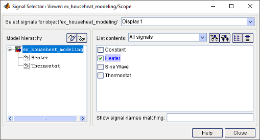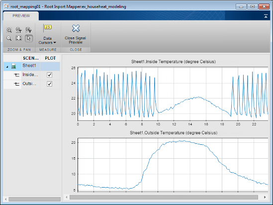 save('ex_househeat_measured_data.mat', 'Sheet1')Сигнальные данные, отображаемые на входные порты, находятся в переменной рабочей области MATLAB. При каждом новом сеансе MATLAB необходимо вручную перезагрузить данные или разрешить функцию предварительной загрузки модели.