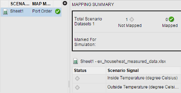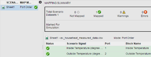 Щелкните Пометить для моделирования (Mark for Simulation). Сводка по сопоставлению показывает Sheet1 помечен для моделирования и Dataset создается в рабочей области MATLAB.