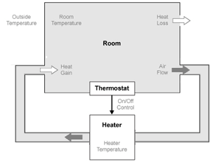 Модель для этой системы включает три компонента: нагреватель, термостат и помещение.