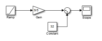 Блок Ramp вводит температуру по Цельсию. Откройте этот блок и измените значение параметра Initial output на 0. Блок усиления умножает эту температуру на постоянную 9/5. Блок «Сумма» добавляет значение 32 к результату и выводит температуру по Фаренгейту.