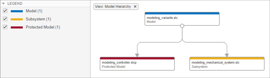 Темно-красные коробки представляют защищенные модели (.slxp файлы). Нельзя открывать или править защищенные ссылочные модели. См. Ссылки на защищенные модели от третьих лиц.