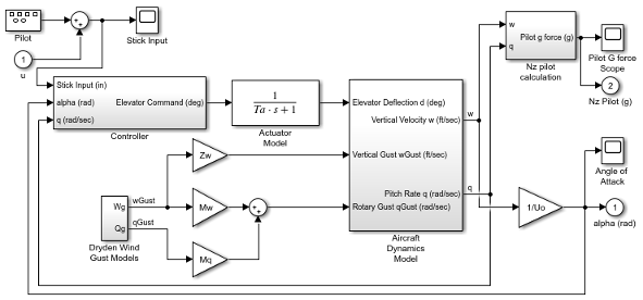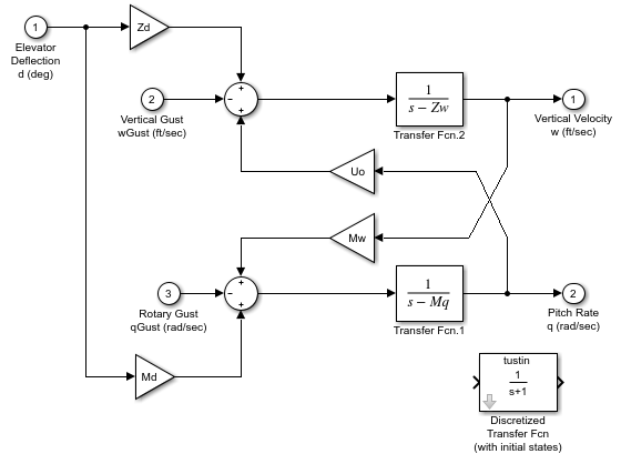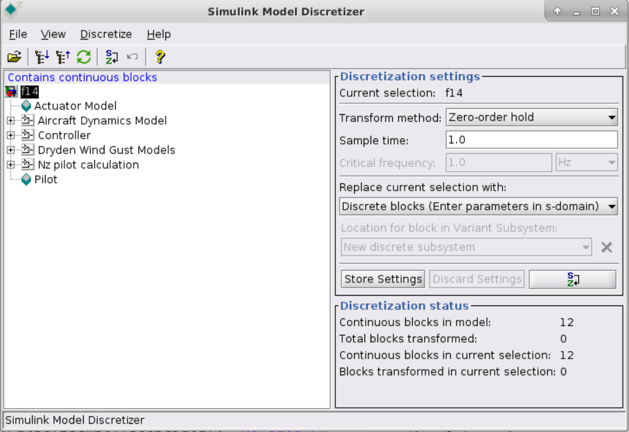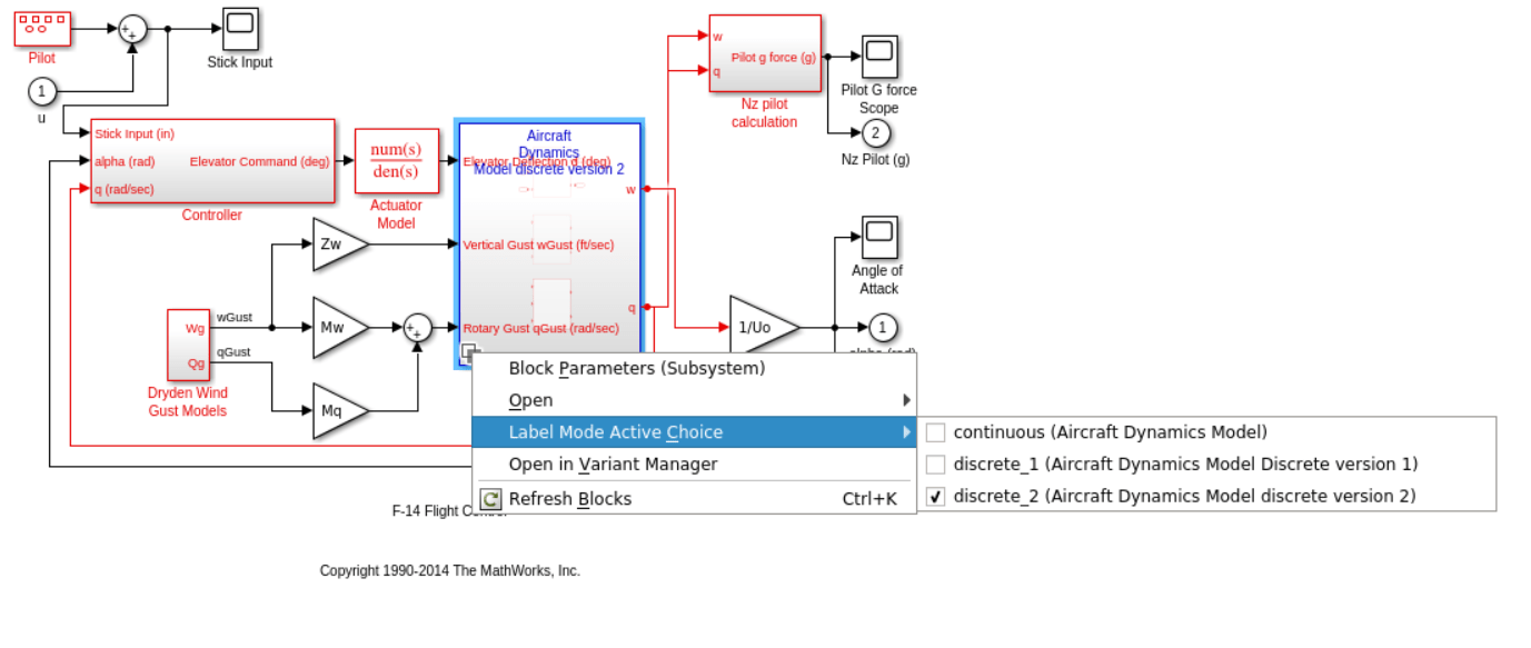Процедура ниже показывает, как заменить непрерывный блок Transfer Fcn в подсистеме модели динамики самолета f14 модель с дискретизированным блоком Transfer Fcn из библиотеки дискретизации. Блок дискретизируется в s-области с помощью метода преобразования хранения нулевого порядка и двухсекундного времени выборки.