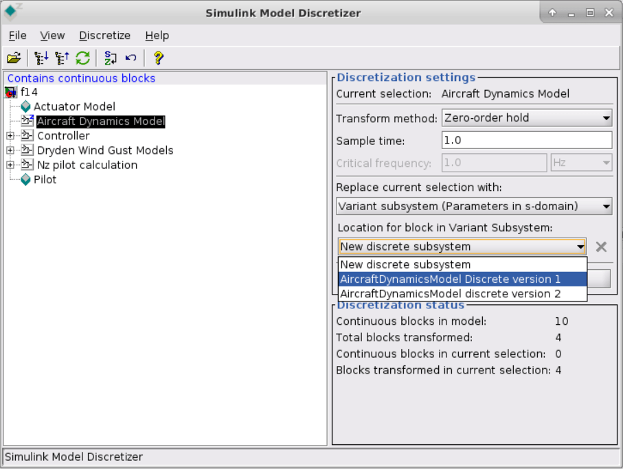 На следующем рисунке показано, что подсистема Aircraft Dynamics Model была дискретизирована в вариационную подсистему с двумя кандидатами на дискретизацию.