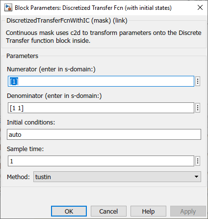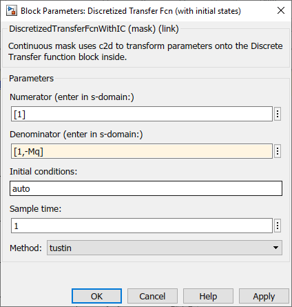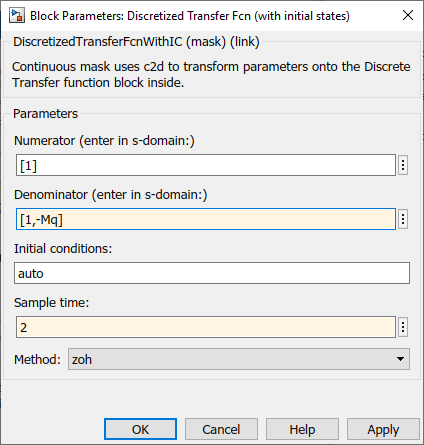 Блок реализован как маскированный дискретный блок, который использует c2d(Панель инструментов системы управления) для преобразования непрерывных параметров в дискретные параметры в коде инициализации маски.