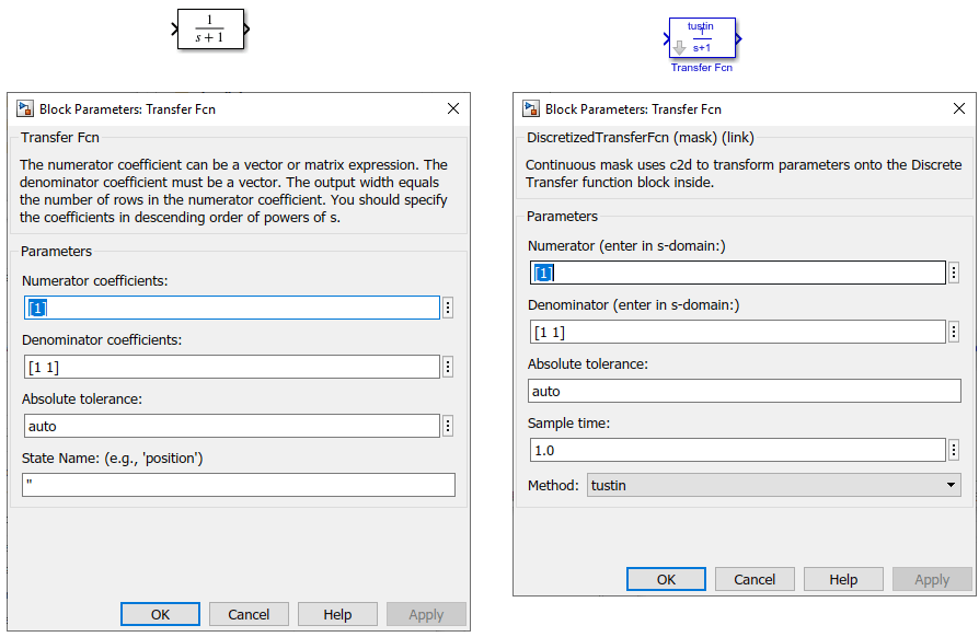 На следующем рисунке показан непрерывный блок передаточной функции рядом с блоком передаточной функции, который был дискретизирован в s-области с помощью метода преобразования Тустина. Под блоком появляется диалоговое окно параметров блока для каждого блока.