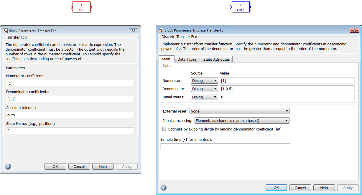 На следующем рисунке показан непрерывный блок передаточной функции рядом с блоком передаточной функции, который был дискретизирован в z-области. Под блоком появляется диалоговое окно параметров блока для каждого блока.