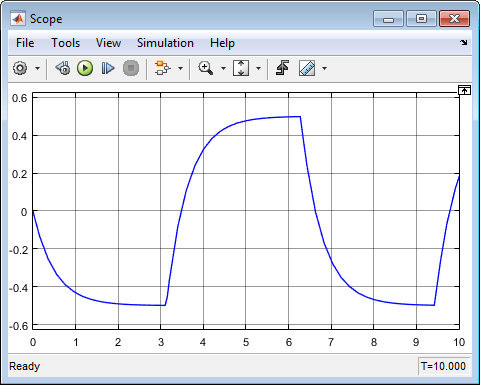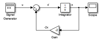где u (t) - квадратная волна с амплитудой 1 и периодичность 1 rad/sec, используйте блок интегратора и блок усиления. Блок интегратора интегрирует свой вход x 'для получения x. Другие блоки, необходимые в этой модели, включают блок усиления и блок суммы. Чтобы создать квадратную волну, используйте блок Генератор сигналов (Signal Generator) и выберите форму Квадратная волна (Square Wave), но измените единицы измерения по умолчанию на радианы/сек. Снова просмотрите выходные данные с помощью блока Scope. Соберите блоки и определите коэффициент усиления.