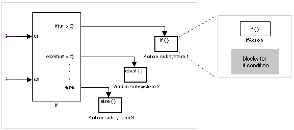 Создайте эти подсистемы, поместив блок порта действия в подсистему. При этом создается атомарная подсистема Action с портом Action, который затем подключается к условию в блоке If.