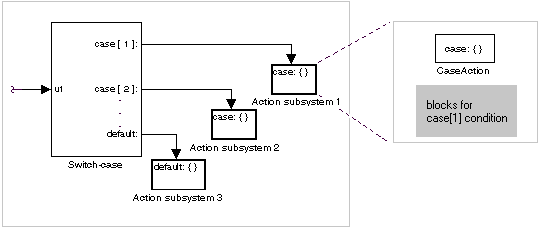 Каждый вариант выхода блока «Switch Case» подключается к подсистеме, которая должна выполняться, если вариант порта имеет значение true. Эти подсистемы создаются путем размещения блока порта действия в подсистеме. При этом создается атомарная подсистема с портом Action, который затем подключается к условию в блоке Switch Case. После подключения подсистема принимает идентификатор состояния и ведет себя как включенная подсистема. Поместите все блочное программирование, выполняемое для данного случая, в эту подсистему.