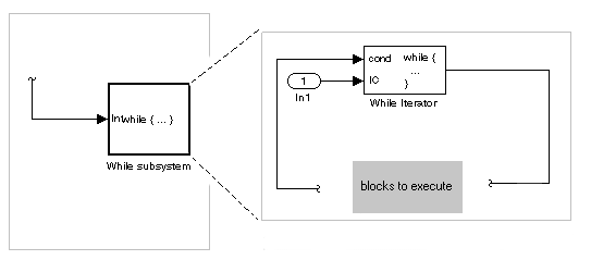 Метка подсистемы хоста изменяется на while {...}, чтобы указать, что он моделирует цикл while. Эти подсистемы ведут себя подобно запускаемым подсистемам. Эта подсистема является хостом блочного программирования, которое необходимо выполнить итерацией с блоком While Iterator.